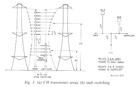 Both the eight-stack and the four-stack arrays were slung on the same centre line as a 'curtain' between the cantilevers of two of the four 360 feet steel towers. R.F. power from the transmitter was fed to the curtain by a 600 ohm, open-wire, balanced transmission line and stub matched to the array. The four-stack array was matched to the transmission line by a quarter-wave transformer of suitable impedance slung in the transmission line to the four-stack. As the system was not a true 'floodlight' because of the directional characteristics of the dipole stack and the suppression of the unnecessary back radiation by reflectors, each station was allocated a 'line-of-shoot' (LOS), which determined the alignment of the antenna with respect to the coastline. THE RECEIVING SYSTEM The simplified block diagram shown in figure 1 illustrates the operating principles: r.f. pulses 'back scattered' from all aircraft in the 'floodlit' zone are received by a set of crossed horizontal dipoles positioned at an effective height of 215 feet above the ground. The output of the E-W dipole (Y) is fed to one of the stator coils of the goniometer and that of the N-S (X) dipole to the other. The signals are com-pared by 'swinging the gonio' for a minimum deflection of the 'echo' on the CRT display. A minimum rather than maximum was used as it gave a sharper and more precise indication of azimuth when the signal-to-noise ratio was adequate, the gonio bearing 'rose' being aligned accordingly. For weak signals, of poor signal-to-noise ratio, the gonio was swung for a maximum, and the indicated bearing corrected by 90o. With this method of direction finding (D/F), an aircraft on a reciprocal bearing would give exactly the same indication on the gonio. This ambiguity was resolved by having remotely switchable reflectors 1/4 wavelength behind the dipoles and noting whether the signal strength increased or decreased when they were switched in. This 'sensing' was done by the operator at the console before passing a plot. The effective height of the crossed dipole stack was 215 feet which, on a flat site, would give rise to a wide vertical gap in the polar diagram centred at an elevation angle of approximately 5.2o; the radar would, therefore be blind at this elevation. This was overcome by having a second crossed-dipole stack at a mean height of 95 feet with a main elevation lobe of approximately 5.9o which, in conjunction with the transmitter 'gapfilling' lobe, effectively closed the gap, the switching being done remotely by the operator at the console whilst searching for, and tracking, targets. Heightfinding was achieved by comparing the signal received by the 215 feet dipole stack (angle = 2.6o) with the signal received from the same aircraft by the 95 feet (angle = 5.9o) stack, the ratio of these two signal strengths being related to the angle of elevation of the aircraft, see figures 4 and 5. The ratio of the signal strengths is measured by feeding the signals received by the Y dipoles of the A system at 215 feet to the Y coil of the goniometer and the signals received by the Y dipoles of the B system at 95 feet to the X coil of the goniometer, see figure 4. The goniometer was then 'swung' for a minimum deflection of the echo on the CRT in exactly the same way that the azimuth angle (D/F) was determined in the direction finding mode. The number indicated by the goniometer pointer was then 'inputted' to a simple electro-mechanical computer known as the 'fruit machine' which also accepted the range of the target and performed the simple calculation: height (in feet) = 5280 (R sin angle+ R2/10000). The R2/10000 term corrects for earth curvature, assuming an effective earth's radius equal to four thirds of the true radius. (This article is taken from "The GEC Journal of Research", Vol. 3 No.2 1985 pages 73-83 and has been reproduced with the kind permission of the Editor. The copyright of the material remains with the owner.) |