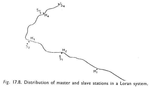 The text that follows in this section is taken from "The Services Textbook of Radio, Volume 7, Radiolocation Techniques" by Brig. J. D. Haigh, O.B.E., M.A., M.I.E.E., Edited by the staff of "Wireless World", H.M.S.O., London, 1960 pages 249 - 250. This volume was known to the British armed forces as Admiralty B.R.600(7), War Office 10224(7) and Air Ministry A.P.3214(7). The restrictions on range implicit in the choice of radio and recurrence frequencies for the Gee system led to the development of Loran whose name is derived from Long Range Navigation. Frequencies in the range 1.7 to 2 Mc /s are employed which not only give much greater ranges than the Gee system but also make possible the synchronization of the stations by radio up to distances of about 300 miles. Use of such a low frequency entails the use of much longer pulses owing to the necessity to economise in bandwidth, and a pulse length of 40 uSec was chosen. The pulses are emitted at a recurrence frequency of about 25 per second, the exact recurrence frequency being used to identify a master and its slave. Although the same arrangement of master stations with two slaves that is used in Gee could be used in Loran, it is more usual to establish a chain of pairs of stations as shown in Fig. 17.8. This is due to the fact that difficulties in synchronization, due to ionospheric effects are experienced when more than one slave is used.