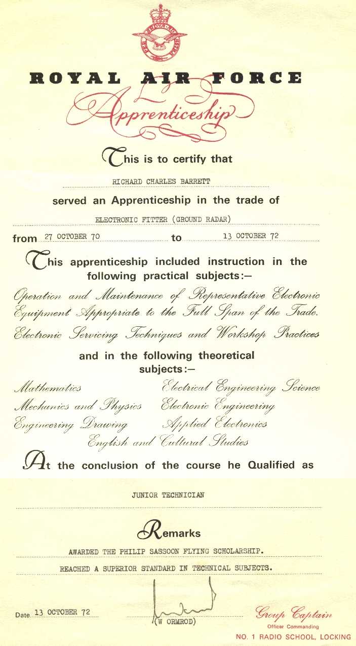 There was something of a dark side too; it has to be said that early in the apprentice's training some bullying went on, mostly "public school" stuff but bullying non etheless. One or two individuals were less than particular about their personal hygiene; if their body odour became unbearable they soon found themselves being thrown into a bath full of cold water, covered with " Vim" (a powder based scourer) and orange floor polish and rubbed down with scrubbing brushes and bass brooms. Late night raids on the barrack blocks of junior entries were not uncommon, the occupants being tipped out of their beds and their room trashed being the usual consequences though occasionally someone got hurt. More seriously, I recall one individual in our entry named Bamford who struck terror into many and was who best avoided if possible. On one occasion he was picking on one of the slighter built boys in the washroom early one morning as we were carrying out our ablutions. I made some comment along the lines of "leave him alone" and in moments ended up on the floor with a bloodied nose and eyes that soon gave me a panda-like appearance. I've never seen a room empty so quickly. In fairness to the adult NCO's I have to say that the incident was somehow brought to their attention and Sergeant Greaney asked me some very searching questions regarding the state of my face. He had a good idea of what had happened and I think that all he needed was a complaint to make it all official. I kept quiet though, for several conflicting reasons. Firstly, I didn't want any more to do with Bamford if I could help it and I certainly did not need another hiding but secondly, and more importantly to my way of thinking, if I complained I was "squealing" and admitting that not only could I not take care of myself but that the entry could not take care of its own dirty business. Not long after this incident Bamford became just another boy sent home deemed unsuitable for apprentice training; a small part of the general training attrition that over the ensuing two years reduced our entry's numbers from somewhere over 100 boys to 35 or less. Then it was back to school. The range of skills taught to Royal Air Force craft apprentices was very impressive, for as well as the traditional class room subjects of English, Science and Mathematics we were also taught Electronics and Electrical Engineering We were taught to fault find on radar systems right down to component level, something we rarely get to do in these days of modular equipment and multi layer printed circuit boards that are thick with surface mounted components. Faults were simulated by inserting faulty components into the circuits, un-soldering wires or by "frigging" relays by inserting small pieces of paper between the contacts. To get some idea of the scope of the training check out my Apprenticeship Certificate by clicking on it. I am particularly and unashamedly proud of the certificate and the comments that appear at the bottom. The quality of the training was second to none and I firmly believe that there has been no other training scheme, before or since, that comes anywhere near a Royal Air Force Craft Apprenticeship. We took part in two "camps" whilst I was at Locking, where we learned about living under canvas, hill walking, climbing, canoeing, radio operating, map reading, how to use a magnetic compass and how apprentices can survive on the hills without doing too much damage to either themselves or the hills. The first camp was a few days in the Quantock hills in Somerset, the second was two weeks (I think) in the Brecon Beacons in Wales. Naturally, the RAF chose locations that were remote from civilization, more to protect the locals than to teach us self reliance. However the apprentice's ability to quaff large quantities of alcoholic beverages coupled with our new found map reading skills meant that we could navigate an unerring course to the nearest pub (usually in the nearby village of Llanfrynach) in the foulest of weather. Many of the things we do in our youth are known as "right s of passage"; one result of these camps was that our new found climbing and rope skills were soon put to use accessing a vertical sla b of rock in Cheddar Gorge where we proudly painted "219", our entry number, in large numerals alongside those of our predecessors. I think "Wally" Waldren had a hand in this escapade. Can anyone tell me if all those entry numbers are still there? One of the inevitable facts of life about being a "Brat" was spor ts; every Thursday afternoon was given over to the healthy pursuit of various shapes of ball over varying grades of terrain. Not long after our arrival Sergeant Greaney took us to the ring to see if we had any boxers amongst us. I was matched against Steve Smart, a young man from the Ground Radio side of our entry who seemed to have very long arms as he immediately got inside my guard and knocked the senses out of me. Within
