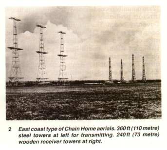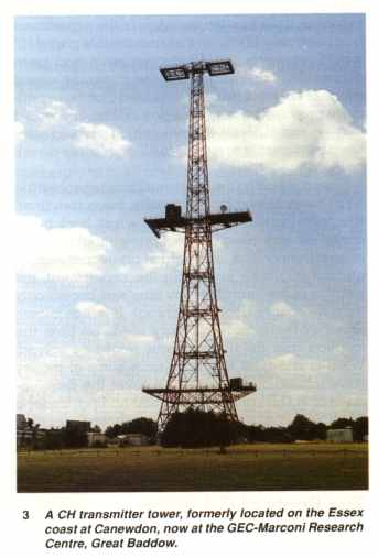 Technical Outline of CH Stations Neale's paper(3), published in 1985 under the editorship of the present author to celebrate the fiftieth anniversary of the birth of British radar (that is, the Daventry experiment), is by far the best overall technical account of a CH station, and should certainly be read, if possible, by those interested. Here only a much shorter account is given; if this leads readers to Neale's account (which may not be easily accessible to some), so much the better. Technical accounts of the transmitter(4) and receiver(5) have been given in post-war papers by the developers of these components. The most striking features of on East Coast CH station were the towers: three steel towers, each 110m high and with three cantilevered platforms on each side (fig. 2) carried the transmitter arrays†, while four 73 m wooden towers carried the receiving arrays. The two sets of towers were perhaps 300m apart, and each group had a low building, surrounded by an earth-banked anti-blast wall, near the foot of the towers and housing the two transmitters, in the one case, and the two receivers and the operations room in the other. By comparison with the towers, the buildings were inconspicuous and bomb-proof, except for a direct hit. Even the towers, with their lattice construction, were difficult to damage by bombing or gun-fire from the air. †One of these transmitter towers, perhaps the last to survive, can be seen at the MRC site at Great Baddow and is shown in fig. 3. It was originally installed at Canewdon in Essex, one of the earliest CH stations and was transferred to its present site in 1359 when the Canewdon station was demolished. The tower is therefore about 55 years old. |