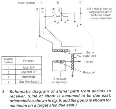 A target due east of the station would give a signal only in the N-S dipoles, and this would be transferred to the N-S coils of the goniometer. The goniometer would pick up a maximum signal when its search coil also lay in the N-S direction, and a minimum, (ideally, zero) signal when the search coil lay E-W Hence, if the gonio pointer is aligned with its search coil, it will point to the east, that is, to the bearing of the target, when the gonio is set for minimum signal. An ambiguity could arise here, since the goniometer would also give a minimum for a target bearing due west, or even when its search coil was 1800 from the true bearing. In practice, the ambiguity was resolved by the use of the sensing dipole before any attempt was made to take a bearing.
