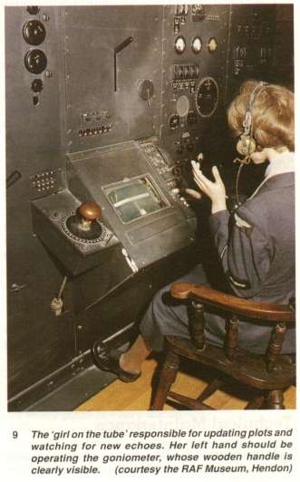 The most important operator, by far, was the girl 'on the tube' (fig. 9). It was her duty to update plots on existing tracks at regular intervals, while at the same time watching for new echoes: to this end, the gonio was swung continuously. Since the bearing of a target was determined by swinging the gonio for a minimum (zero) echo, the station was blind on that bearing, or indeed on any bearing on which the gonio rested: hence, the first rule for operators was that the gonio must always be swinging over the full 1000 or so of the station coverage. The girl on the tube, together with the others of the team, were paralleled together on the telephone to the plotter in the filter room, who would accept the plots, allocate track numbers (H-for hostile, F- for friendly, X- for unknown), allot priorities ('another plot on X-, please', 'can you get a height on H- ?') and probe for information 'Staxton has a plot about 120 miles from you: can you see anything?' (Staxton being the neighbouring station). The routine of establishing a new track was quite complex. If the operator noticed a new echo, which would first show as a tiny break in the noise, she would at once 'sense' it to determine that it was in fact in front of the station before announcing 'I have a new echo at such and such a range'. She would then sense again, to determine whether the target was north or south of the 'line of shoot'. She would then attempt, by swinging the gonio for a minimum, to take a bearing, and then a height. |