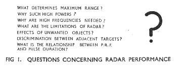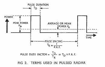 AP 3302 Pt. 3 Section 1 CHAPTER 3 Factors affecting the performance of Pulse-Modulated Radars Introduction Although we now know something of the basic operation of a pulse-modulated primary radar there are still many questions left to be answered (Fig 1). In this chapter we shall attempt to answer these, and similar, questions. Terms Used in Pulsed Radar We have already met some of the terms used in pulse-modulated radar. Let us now define those terms more precisely and then go on to show their relationship with other, equally important, terms (Fig 2). The waveforms shown in Fig 2 are 'ideal', i.e. we have assumed zero rise and decay times. In practice each pulse is more rounded because it takes a finite time to rise and to fall. However the ideal waveforms shown are adequate for our purpose. Note that the axes used in Fig 2 are power against time although more usually the waveform refers to voltage and time. Pulse repetition frequency. This is the number of pulses occurring in one second. For a p.r.f. of 500 p.p.s. the pulse spacing Tr is 1/500 second or 2,000 microseconds. The value of p.r.f. normally lies between about 200 and 6,000 p.p.s. Pulse duration. The pulse duration Td is the length of time for which the transmitter is switched on to give each pulse. It normally lies between about 0.l and 10 us. |