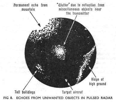 With pulse-modulated ground radar equipment reflections from large fixed objects cause permanent echoes on the indicator, and random reflections from small objects close to the radar cause clutter at the centre of the p.p.i. (Fig 8). For most applications the receiver should ignore reflections from fixed objects and respond only to moving targets. This can be achieved by using the Doppler effect because a Doppler frequency is produced only by the radial velocity of a moving target. For a stationary object the reflected signal has the same frequency as the transmitted signal.