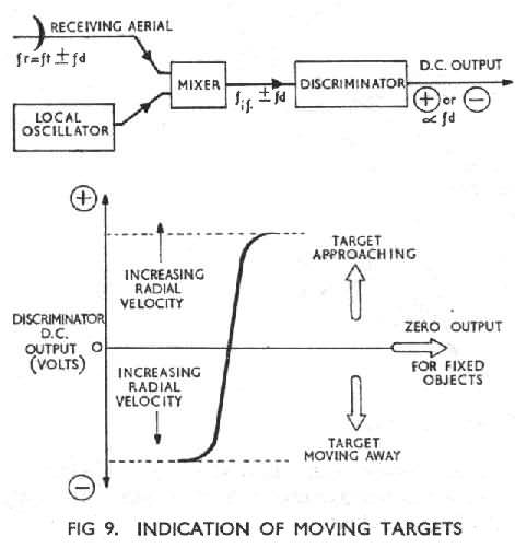 Fig 9 illustrates a typical arrange-ment for the indication of a moving target. The frequency fr of the reflected signal differs from that of the trans-mitted signal ft by the Doppler shift fd. The reflected signal is mixed with the output of a local oscillator to produce an i.f. signal (fif±fd) where fd is the Doppler shift. This signal is amplified and fed to a discriminator whose output is either a positive-going or a negative-going d.c. voltage depending upon whether the frequency of the reflected signal is above or below that of the transmitter. Remember that the frequency of the reflected signal increases if the target is approaching and decreases |