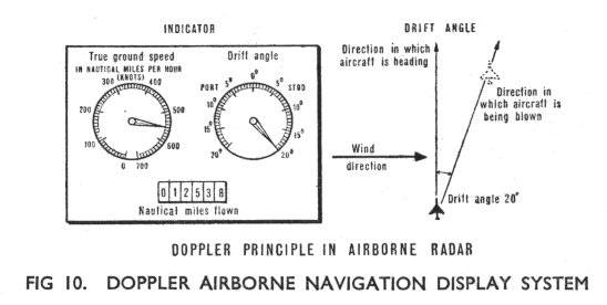 in frequency. Note that c.w. Doppler does not measure the range of a target. For this we use either pulse-modulated radar or f.m.c.w. radar. Use of the Doppler Effect in Airborne Radar If the radar transmitter is located in an aircraft the signals reflected from the ground ahead of the aircraft will also be subject to the Doppler effect. Use is made of this property in aircraft navigation. To navigate accurately one important factor which must be known by the navigator is the ground speed of the aircraft. This may be quite different from the air speed. Let us see how the Doppler effect helps here. Since the ground ahead of the aircraft is being illuminated by the radar beam from the airborne transmitter it will reflect energy back towards the aircraft. The aircraft is always moving towards the apparent source of radiation and so the received frequency fr is higher than the transmitted frequency ft by the Doppler shift fd, i.e. fr = ft + fd. The Doppler shift is deter-mined by the radial velocity of the aircraft and is given as before by the expression fd = (2v/c) ft. Special circuits in the receiver automatically measure the Doppler shift and the receiver output can be displayed on a simple meter calibrated in m.p.h. A practical equipment which uses this system transmits not one radar beam but four at different points around the aircraft. The information which is received from all four points on the ground is used to eliminate errors which would otherwise arise when the aircraft is climbing, diving or banking. The four beams also enable the drift of the aircraft to be calculated. A typical meter display is illustrated in Fig 10.