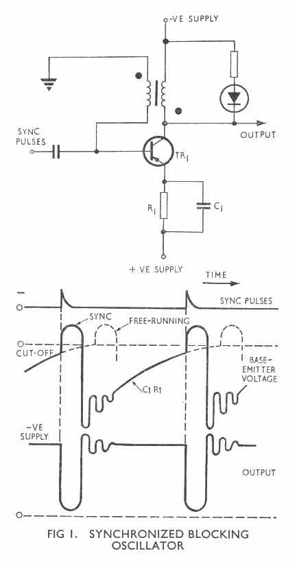 where n may be any whole number between one and about ten. Frequency Division We know from previous work that both the astable multivibrator and the free-running blocking oscillator may be synchronized by applying appropriate sync pulses to the control grid (valve version) or to the base-emitter circuit (transistor version). The p.r.f. of the sync pulses must be slightly higher than that of the free-running circuit (Fig 1) and their amplitude must be such that they lift the circuit into conduction before it would normally cut on. The output is then ‘locked’ to the sync pulses. Frequency division is merely an extension of this idea. The p.r.f. of the input pulses is now made much higher than that of the free-running circuit and the circuit constants are then adjusted such that, say, every third input pulse brings the circuit prematurely into conduction. In this case one output pulse is produced for every three input pulses and the circuit is said to have a count-down ratio of 3 :1. Count-down ratios of up to about 10:1 may be obtained in this way. Application of Frequency Division Frequency dividers have many applications. We shall consider only one at this stage. We saw in an earlier chapter that cal pips may be used to calibrate a type A display. A display with large cal pips at ten-mile intervals and small cal pips at five-mile intervals may be required. A cal pip generator, consisting of a triggered blocking oscillator, may be used to provide the five-mile cal pips (Fig 2). The output from this is applied to the display and also as the input to a frequency divider. This may be a free-running blocking oscillator so adjusted that every second input pulse from the cal pip generator brings the divider into conduction slightly earlier than normal. The frequency divider therefore produces one output pulse for every two input pulses so that its frequency is half that of the input. This circuit therefore produces ten-mile cal pips. |