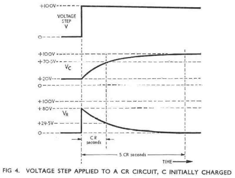 AP 3302 Pt. 3 Section 2 CHAPTER 2 Square Waves applied to CR circuits Subsequently C discharges through R causing Vc to fall exponentially from + 60V towards zero and Vr to rise exponentially from -60V towards zero (Fig 3). As we can see from Fig 3 the period of the square wave applied to the CR circuit is such that C can just charge or discharge completely during each half-cycle. We can also see that the waveforms of voltage across C and across R are not square waves. Variations in the Basic Circuit If a sudden voltage (a voltage 'step') is applied to a CR circuit in which C already has an initial voltage, the time constant is still CR seconds to the voltage step. In time CR seconds the voltage across C changes by 63 per cent of the difference between its initial voltage and the voltage step. Thus if C is charged initially to 20V, and 100V is then suddenly applied to the circuit, Vc rises to 20 + (63/100 x 80) = 70.5V in CR seconds and to 100V in 5 CR seconds (Fig 4).