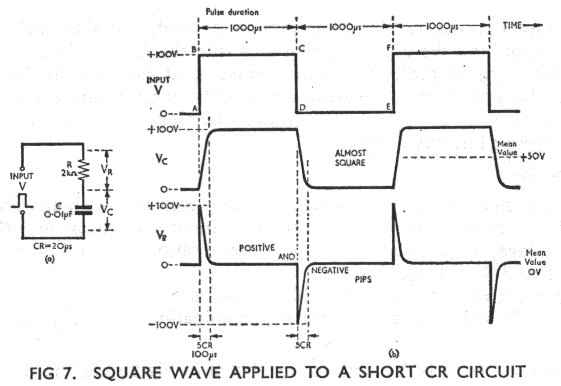 (or less) we call the combination a short CR circuit. Note that a circuit can be stated to be a short, medium or long CR circuit only in its relationship to a given input. A circuit which acts as a short CR to one input may well be a long CR to another. Short CR Circuits Let us assume that a symmetrical square wave of voltage, of amplitude 100V and pulse duration 1,000 us, is applied to a CR circuit where C = 0.01 uF and R = 2,000 W (Fig 7a). Time constant CR=0.01 x 10-6 x 2,000=20us.