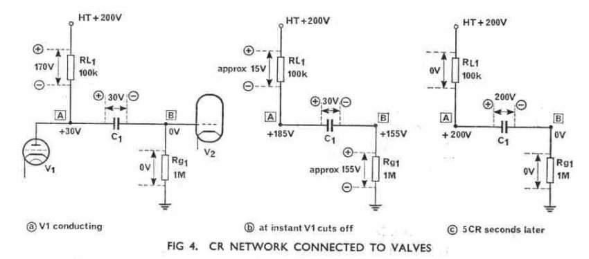b. Monostable multivibrator. This circuit has only one stable state. When it is triggered by an external signal it passes into the other state, remains there for a given time and then returns, of its own accord, to the first (stable) state. It will remain in the stable state until another triggering input pulse is received. This circuit is also referred to as a "one-shot multivibrator" because it goes through a full cycle in response to a single triggering pulse. A more common name however, and the one we shall use in these notes, is "flip-flop". c. Bistable multivibrator. In this circuit both states are stable, the circuit remaining in either of them indefinitely. It passes from one state to the other only when suitably triggered, and to go through a full cycle two triggering pulses are needed. This circuit is also known as a bistable trigger circuit, a toggle or an Eccles-Jordan circuit. Note that only the astable multivibrator is free-running. The others must be triggered. |
