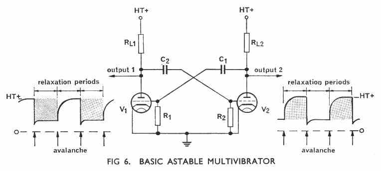 a. The periods corresponding to the vertical parts of the waveforms, when both valves are conducting and acting as amplifiers with positive feedback from each anode to the other grid. This condition is unstable and initiates a cumulative action or avalanche which very quickly drives one valve well beyond cut-off and causes the other to conduct heavily. b. The periods corresponding to the 'fiat' parts of the waveforms during which one valve is conducting heavily and the other is cut off but approaching the point where it will cut on. This is the relaxation period. Let us imagine that the circuit is approaching the end of a relaxation period and that V2 is conducting heavily (with its grid clamped to zero volts by grid current limiting) and V1 is cut off but rising towards its cut-off point. With V2 conducting, its anode voltage will be at a low working value, depending upon the valve current and the values of RL2 and h.t. Also, since V1 is still cut off, V1 anode will be at the same voltage as h.t.+ (no current through RL1 and no voltage drop across it). This condition before the start of an avalanche, is illustrated in Fig 7a. |