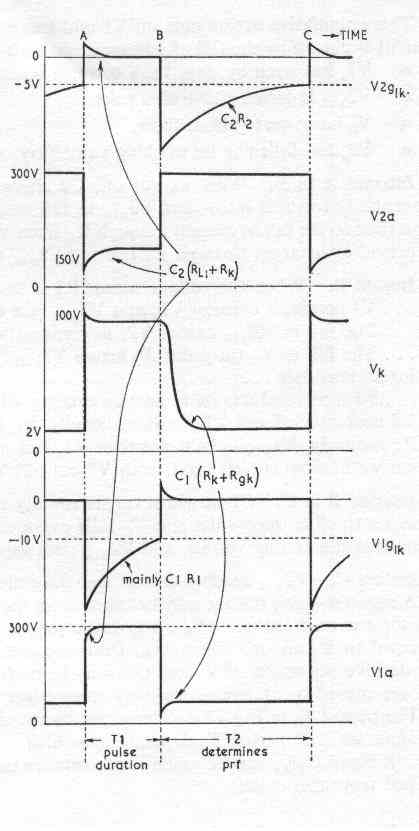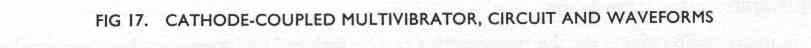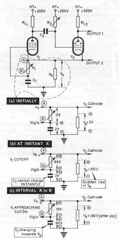 Let us assume that the circuit is oscillating with V1 conducting and V2 cut off but with its grid voltage just about to reach cut-off (say - 5V). Then initially V2a = h.t. (+ 300V); VK is a low value (say + 2V) because of the small current passed by V1; V1gIK is held at zero volts because there is no voltage drop across R1 (see Fig 17a); and V1a is at its low working voltage (say + 30V). Instant A. V2gIK rises to cut-off... ... V2 conducts causing V2a to fall and VK to rise (because of the increased current from V2 through RK). ... Cl cannot charge instantly so that the sudden rise in VK is developed across R1 (see Fig 17b); V1gIK thus falls as shown and, with point B going negative with respect to point A, V1 cuts off. ... V1a thus rises towards h.t. and this rise is transferred through C2 to cause V2gIK to rise also... ... V2 conducts more heavily, causing V2a to fall further. |