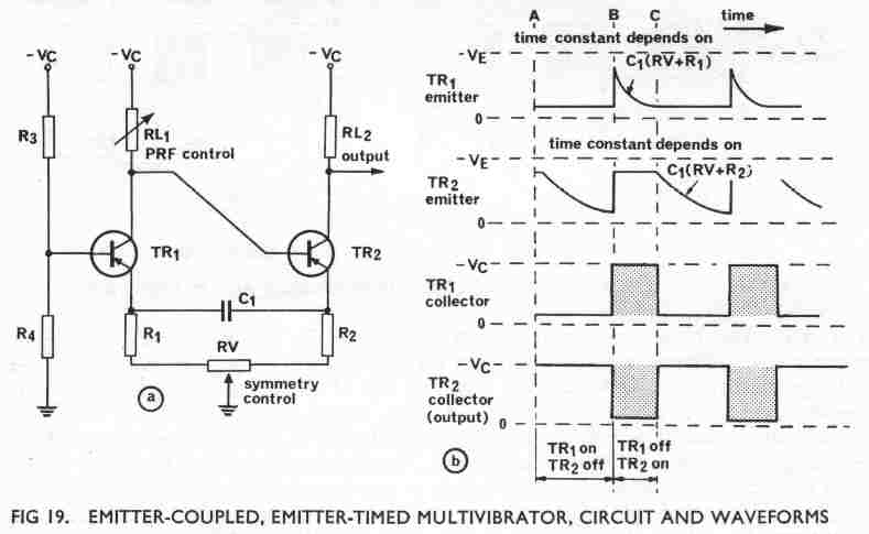 AP 3302 Pt. 3 Section 2 CHAPTER 6 Free Running (Astable) Multivibrators Interval A to B. C1 charges through RL2 causing VB1 to return to zero and VC2 to rise towards - 12V with a time constant of C1RL2 seconds. C2 discharges through R2 and VB2 rises towards the negative aiming voltage with a time constant of C2R2 seconds. Instant B. As soon as VB2 rises through cut-off TR2 starts to conduct and a second avalanche takes place with the roles of TR1 and TR2 reversed in relation to those at instant A. This second avalanche cuts off TR1 and leaves TR2 conducting. VC2 falls rapidly to its working value, VB2 rises above zero volts, VC1 rises by the same amount and VB1 falls to a positive value well beyond cut-off. Thereafter the action is repeated. The output may be taken from either collector or from both. The remarks made earlier about control of frequency and symmetry and the use of an aiming voltage are applicable to this circuit also. In addition the circuit may be synchronized by applying negative-going sync pulses to one or the other or both bases. Emitter-coupled Emitter-timed Multivibrator Steeper leading edges can be obtained, as in the cathode-coupled multivibrator, if the capacitor connected to the output electrode can be eliminated. In the cathode-coupled multi-vibrator V2 anode had no coupling capacitor connected to it so that V2a output had very steep leading edges. The transistor equivalent is the emitter-coupled, emitter-timed circuit shown in Fig 19a. The action may be explained with reference to Fig 19b.
