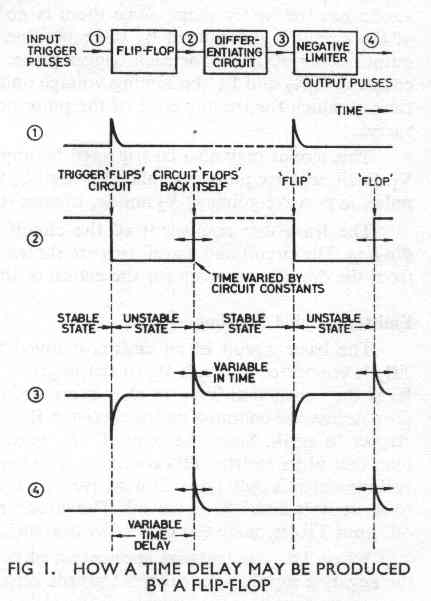 Anode-coupled Flip-flop The circuit of a basic anode-coupled flip-flop and its associated waveforms are illustrated in Fig 2. The circuit is similar to that of the free-running anode-coupled multivibrator discussed in p 110. The main differences are: a. The grid of one valve (V1 in this circuit) is taken to a negative bias voltage instead of to earth or a positive aiming voltage. This bias is sufficient to hold V1 below cut-off in the absence of a trigger pulse. b. The cross-coupling impedance between V2 anode and V1 grid is normally a resistance (R3 in this circuit). A capacitance may however be used in some circuits. |