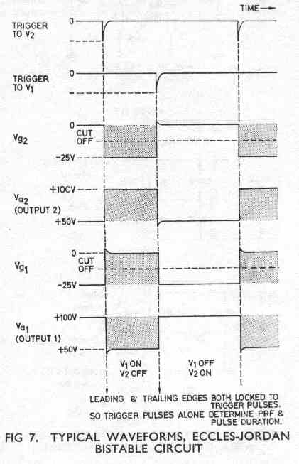 This represents one stable state in which V1 is cut off and V2 is conducting. This state can be held indefinitely because there are no capacitors in the circuit to discharge and lift Vg1 to the cut-off point, ie there is no true 'relaxation period' in this circuit. To switch over to the other stable state we can apply either a positive pulse to V1 grid to cut on V1 or a negative pulse to V2 grid to cut off V2. Of the two methods the application of a negative pulse to the conducting valve is more common because a larger triggering voltage is usually required to cut on a non-conducting valve. If we apply a negative trigger pulse to the grid of the conducting valve V2, its anode current falls and Va2 rises. This causes Vg1 to rise and V1 conducts. An avalanche thus occurs to switch the circuit over to its other stable state in which V1 is conducting and V2 is cut off. Again it will remain in this state until triggered out of it. This is done by applying another negative trigger pulse, to the grid of V1 this time. The waveforms for this circuit are shown in Fig 7. Note that the p.r.f. and the pulse duration are both determined by the trigger pulses.