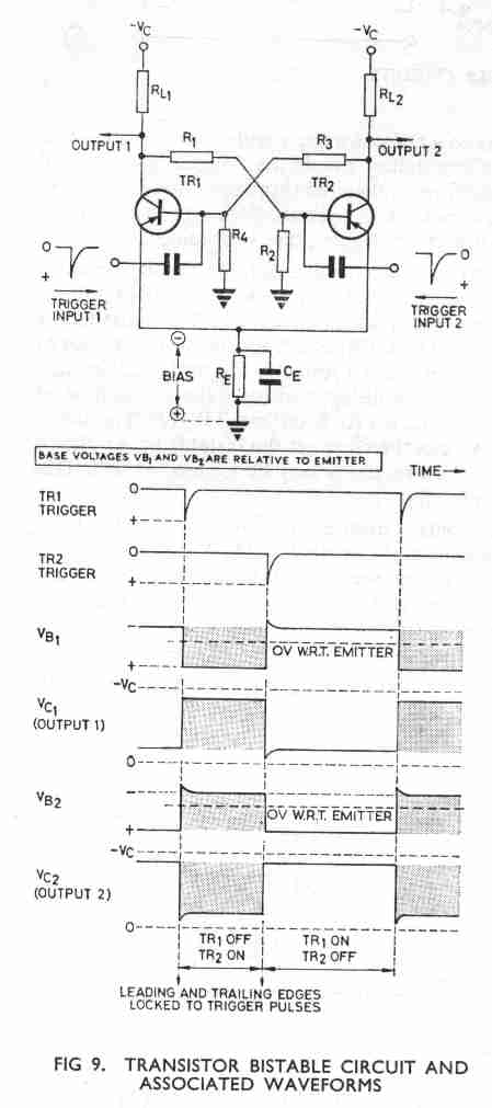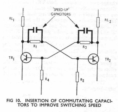 So far we have assumed that the output electrode has no capacitance connected to it so that the voltage at the output electrode can rise and fall very rapidly, giving steep-sided outputs. In practice, the grid-cathode input capacitance (in the valve version) and the base-emitter input capacitance (in the transistor version) will charge and discharge via the appropriate cross-coupling resistance in accordance with the voltages acting on the capacitances. This charge and discharge obviously takes time and the result is that the switching speed is limited and the output wave-forms are not so steep-sided. To reduce theseo effects, Eccles-Jordan circuits often have small capacitors in parallel with the cross-coupling resistors (Fig 10). These 'speed-up' or 'commutating' capacitors cause faster switching because any voltage change at the anode (or collector) is immediately transferred to the input of the opposite stage.