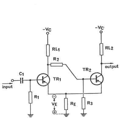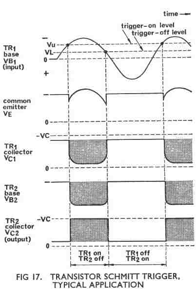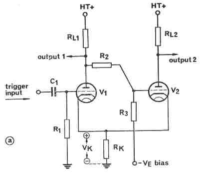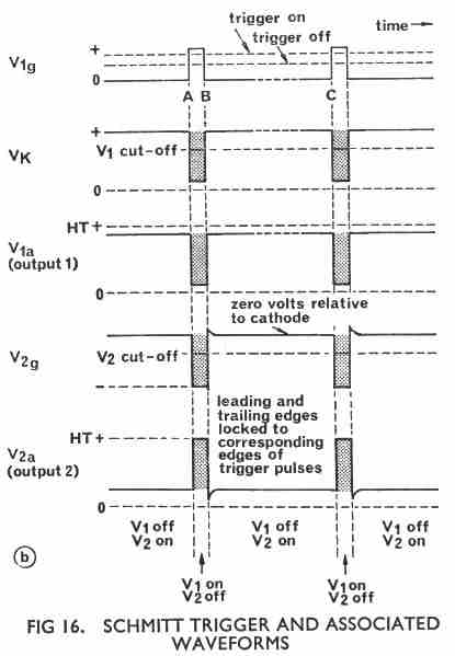The basic circuit of a Schmitt trigger using valves is shown in Fig 16a, with associated wave-forms in Fig 16b. Under normal conditions, with no trigger input applied to V1, V2 is conducting heavily and the resulting voltage drop across RK raises the cathode voltage VK of both valves above earth. With V1g at zero volts, VK is sufficiently positive with respect to V1g to keep V1 cut off. V1a is thus at a high voltage (determined by the values of RL1, R2, R3 and the h.t. and bias voltages). V2g is also determined by the potential divider connected between h.t. + and the negative bias point. These are adjusted such that V2g tends to go positive but is held at zero volts relative to its cathode by grid current limiting. V2a, is therefore at its working voltage. This is the first stable state, in which V1 is held cut off and V2 is conducting. |