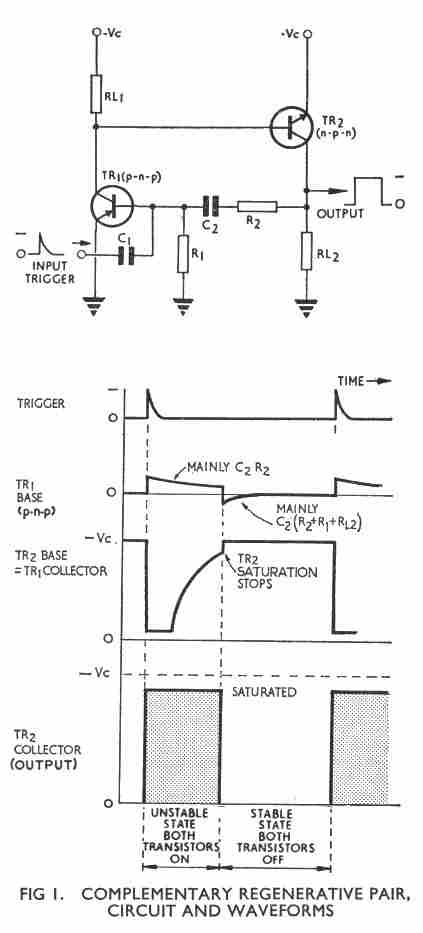 Although the majority of pulse generators are based on one of the family of multivibrators discussed in the preceding chapters there are occasions when other circuits capable of producing a rectangular wave output are preferred. Many of these circuits use only one stage and are used mainly for special applications. We shall consider some of these circuits in this chapter. Complementary Regenerative Pair Circuit This circuit uses transistors of opposite polarity-one p-n-p and the other n-p-n - and has no valve equivalent. One version of the circuit is illustrated in Fig 1. It is, in effect, a monostable or flip-flop circuit. In this arrangement TR1 is a p-n-p transistor and TR2 a n-p-n type. TR1 therefore requires a negative voltage to its base to cut it on, and TR2 base must be positive with respect to its emitter before it conducts. In the quiescent condition both transistors are off. Before the application of a trigger pulse, with no current to its base, TR1 is cut off and its collector voltage is at -Vc. There is therefore no drive voltage to the base of TR2 which is also cut off. Under these conditions C2 is discharged and the output is at earth. This is the stable state. If we apply a negative trigger pulse to TR1 base, TR1 cuts on and its collector voltage falls towards earth because of the voltage drop across RL1 (Note that we are using the 'negative up' convention in this circuit). TR2 base is therefore driven down and becomes positive with respect to its emitter so that TR2 also cuts on. TR2 collector voltage then rises towards -Vc because of the voltage drop across RL2, and the output also rises. This rise is applied through C2 (which cannot charge instantaneously) to the base of TR1 where it drives TR1 hard on. An avalanche therefore occurs which 'flips' the circuit into the state where both transistors are conducting (and saturated). This is the unstable state in which TR1 collector voltage is steady at just above zero volts and TR2 collector voltage is steady at just below -Vc. The duration of the unstable state depends upon the time taken for TR2 to come out of saturation.