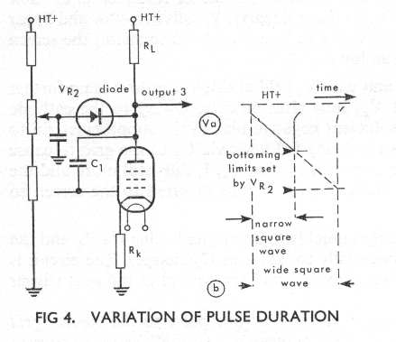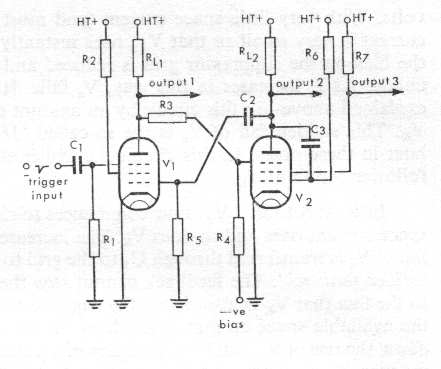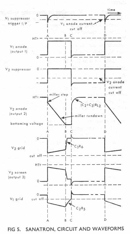 We have similar cross-coupling impedances between the two stages, one a resistor and the other a capacitor. Unlike the multivibrator however the connec-tion from V1 anode is to V2 suppressor grid and V2 also has a 'Miller' capacitor C3. The arrangement and the action of V2 are similar to those of the phantastron. V1 provides the switching action which returns the circuit to its stable state at the end of the Miller rundown. The circuit may be triggered by a negative pulse either to the control grid or to the suppressor grid of V1. Suppressor grid triggering is more usual. In the stable condition, before the application of a trigger pulse, V1 is conducting normally with its control grid and suppressor grid both at zero volts. V1 anode voltage is therefore low and is sufficient to keep V2 suppressor grid below the anode current cut-off |