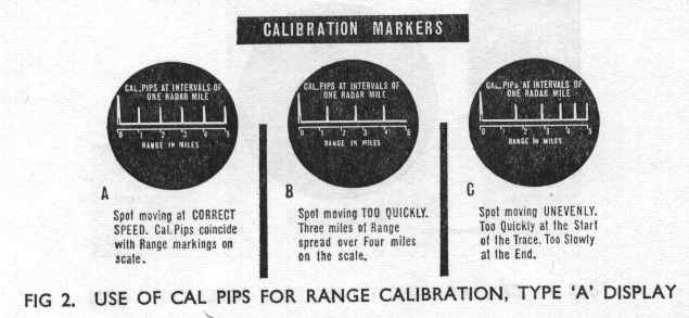 Cal Pips To calibrate any device means to 'check and correct for any irregularities'. Thus when we check to ensure that the spot is moving along the trace at the correct speed we are calibrating the display. One method of calibration is to generate a series of very narrow pulses at intervals of exactly one radar mile (10.75 uS), and apply them to the c.r.t. so that they deflect or brighten the trace to give cal pips at the correct intervals along the trace. If the spot is moving at the correct speed