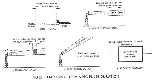 Again, like the p.r.f., the value of pulse duration selected for a radar is a compromise between conflicting factors (Fig 22). Because of this some radars have several values of pulse duration which may be selected as required.