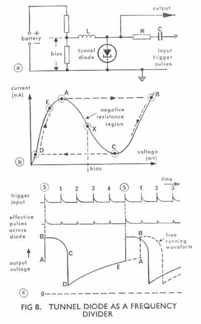 Diode Step-by-step Counters The circuit and waveforms of a basic diode step-by-step counter (sometimes referred to as a diode ‘pump’ circuit) are illustrated in Fig 9. A train of positive-going input pulses is applied to the circuit. The leading edge of the first input pulse at A is applied through C1 to D2 causing the diode to conduct. Both C1 and C2 then charge rapidly through D2 until Vc1 + Vc2 = Applied Voltage (100V). The capacitor C1 is usually small compared with C2. If C2 = 9C1 (typical figures) then one-tenth of the applied voltage appears across C2 (in this example 10V) and nine-tenths is developed across C1 (in this example 90V). At the end of the pulse the applied voltage falls to zero and the voltage across C1 and C2 are then such as to cut D2 off. C2 therefore remains charged to + 10V. On the other hand the voltage across C1 is of the correct polarity to cut on D1 and the diode rapidly discharges C1 to zero. If D1 were not present C1 would also remain charged and there would be no further circuit action. The leading edge of the next input pulse at B again cuts on D2, but since C2 is already charged to + 10V the effective input voltage is now the difference between the applied voltage and Vc2, ie 90V. This new voltage is again shared between C1 and C2 in the ratio one-tenth across C2 and nine-tenths across C1 (assuming C2 = 9C1). Thus C1 charges to 81V and C2 rises by 9V to + 19V. |