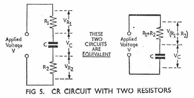 As before, V = Vc + Vr. Hence at the instant the voltage step V is applied, Vr = 80V. It then falls to zero as Vc rises to 100V. A circuit with two or more resistors connected in series with a capacitor behaves as if the resistors were replaced by a single resistor equal in value to their sum (Fig 5). The formula V = Vc + Vr now becomes:- V=Vc+Vr1+Vr2