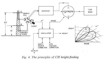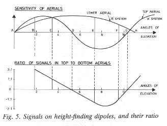 At higher elevation angles (angles above 8o), there was some ambiguity because of confusion with the multiple upper lobes of the 215 feet dipole stack, but these could be quickly resolved by a skilled operator noting the results of a series of readings. In fact, almost all aircraft of interest ('hostiles') were first observed at long ranges and therefore low angles of elevation, so this problem did not often arise. For aircraft in the first elevation gap, heightfinding was achieved using the 95 feet (angle = 5.9o) dipole stack and a third stack at 45 feet (angle = 12.5o). All the measurements were taken using the same goniometer, the feeders from the various antennae elements being selected by the operator, using buttons operating a remote, motorized set of change-over switches. Counting of aircraft in close formation (raid strength) relied on the skill of the operator who, when experienced, was able to make an assessment by observing the 'beat' rate of the composite echoes. To assist in this assessment, the transmitted pulse could be momentarily shortened to 6 microseconds (from 20 microseconds) by a push button on the console, the shorter pulse improving the range resolution by about 3:1.