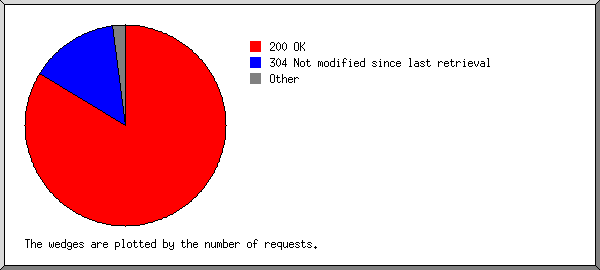 reqs: status code-----: -----------37241: 200 OK 432: 206 Partial content 5: 301 Document moved permanently 6398: 304 Not modified since last retrieval 430: 404 Document not found