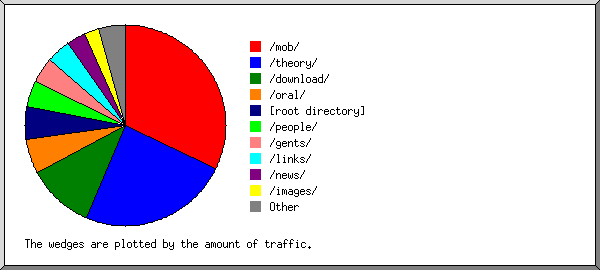 reqs: %bytes: directory-----: ------: ---------10564: 32.09%: /mob/ 9853: 24.19%: /theory/ 692: 10.82%: /download/ 2093: 5.56%: /oral/ 1987: 5.30%: [root directory] 1790: 4.24%: /people/ 647: 4.20%: /gents/ 1855: 3.92%: /links/ 1619: 3.10%: /news/11657: 2.31%: /images/ 631: 1.73%: /help/ 257: 1.47%: /glossary/ 285: 0.70%: /pgp/ 113: 0.33%: /references/ 28: 0.05%: /stats/