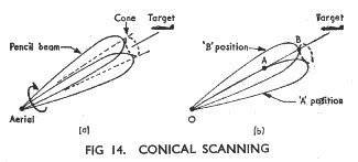 cone is in line with the target (Fig 14a) the aerial is correctly 'aimed'. If the aerial is incorrectly aimed (Fig 14b) the signals received from the A and B positions are proportional to OA and OB respectively. By comparing the two signals the magnitude and sense of the error can be calcula-ted and a correction applied to give automatic 'following' or 'tracking' of an object.