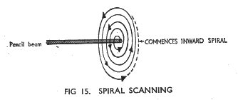 Spiral scanning is a development of the conical scan. A pencil beam is produced by the aerial and the beam is then made to rotate about a horizontal axis in ever-increasing circles to produce a spiral as shown in Fig 15 Angles up to about 60o in both azimuth and elevation may be scanned in this way.