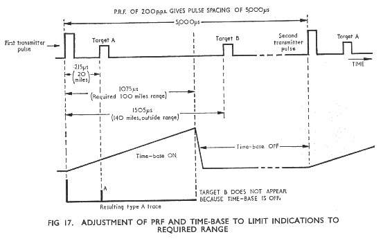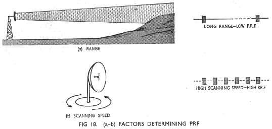 p.r.f. must be reduced. For a p.r.f. of 200 p.p.s. the peak power output is now 103/(200 x 5 x 10-6) = 1 MW. What we are really doing here is to adjust the pulse duty factor - the ratio of pulse duration to pulse spacing. d. Improved definition. The more pulses that are transmitted per second the more pictures are 'painted' on the c.r.t. per second. This means a brighter and clearer display and improved definition. In addition the higher the p.r.f. the more echoes that are received from any one target per second. This means more reports per second on the change in range and direction of a moving target. From what has been said it is clear that the p.r.f. selected for a particular radar must be a compromise between several conflicting requirements (Fig 18). Because of this, many radars have more than one value of p.r.f. for different ranges.