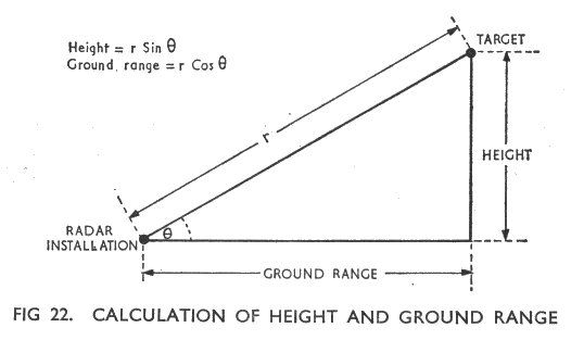 AP 3302 Pt. 3 Section 1 CHAPTER 1 PULSE-MODULATED RADAR dimensional picture. Such radars are in fact often called 3-D radars. It is not usual however to show all the factors on a single c.r.t. display. Normally two c.r.t.s are used, one to show range and bearing (e.g. a p.p.i.) and the other to show range and height. To find the height of a target we use an aerial array which can swing the radiated beam up and down. Fig 21 shows two aircraft which are both at a ground range of 20 miles but are flying at different heights. Two important facts can be obtained from the diagram: a. The actual distance between the radar and aircraft B is much greater than that between the radar and aircraft A. The distance to the target in each case is called the slant range. b. With the radar beam directed at aircraft A the angle between the beam and the horizon (the angle of elevation) is 200. For aircraft B it is 400. Thus the greater the height of an aircraft, at a given ground range, the greater is the angle of elevation. We shall now see how these facts are used to find the height of an aircraft and its true ground range. The known factors are slant range r and angle of elevation 0 of the aerial. From Fig 22: Sin q = Height/r therefore Height = r sin q Cos q = Ground range /r therefor Ground range = r cos q Example. If the slant range of an aircraft is measured as 30 miles and the angle of elevation as 5o Height = 30 sin 5o = 30 x 0.0872 = 2.6 miles or 13,720 feet. Ground range = 30 cos 5o = 30 x 0.9962 = 29.89 miles.