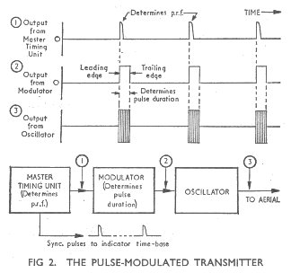 AP 3302 Pt. 3 Section 1 CHAPTER 2 Basic Requirements Of A Pulse-Modulated Radar System A radar transmitter also operates at a very high frequency and, for the duration of each pulse, produces a very high peak power output. Frequencies up to 30,000 Mc/s are common and peak powers of 1MW and more are used. The high powers are necessary to ensure adequate 'illumination' of the target so that a good echo may be received. We shall see the reason for the use of the high frequencies later. The system used to produce the high-frequency, high-power pulses of short duration at a required repetition rate is illustrated in block schematic form in Fig 2.